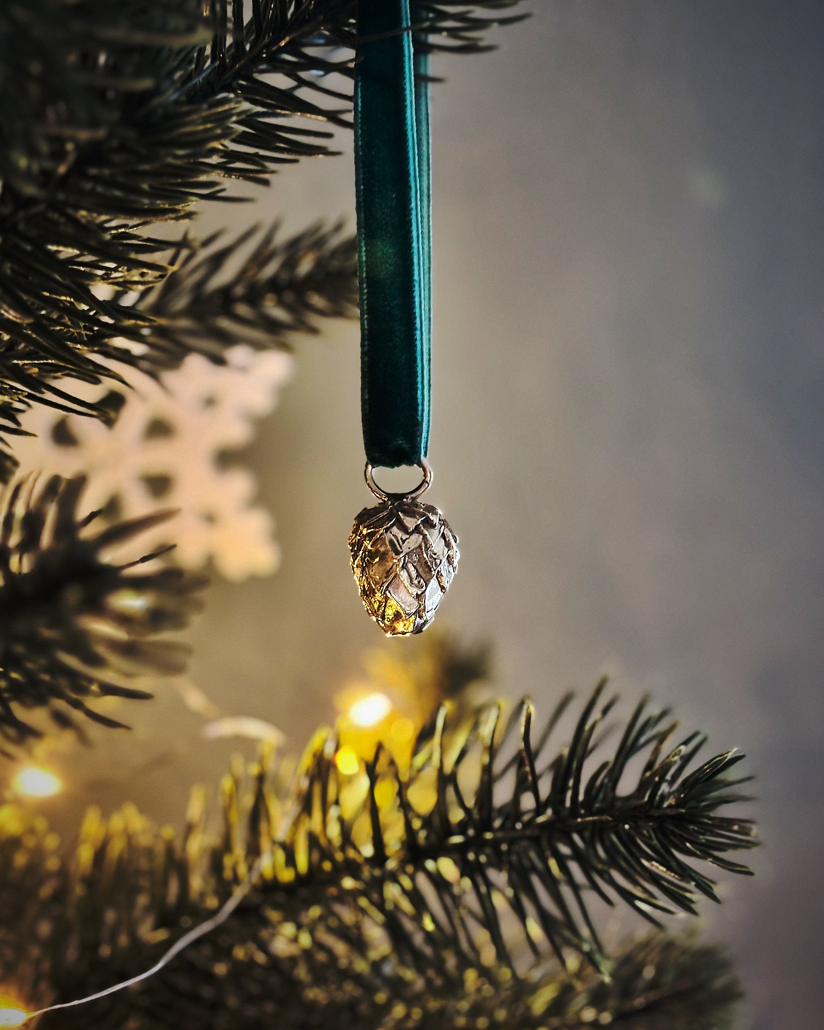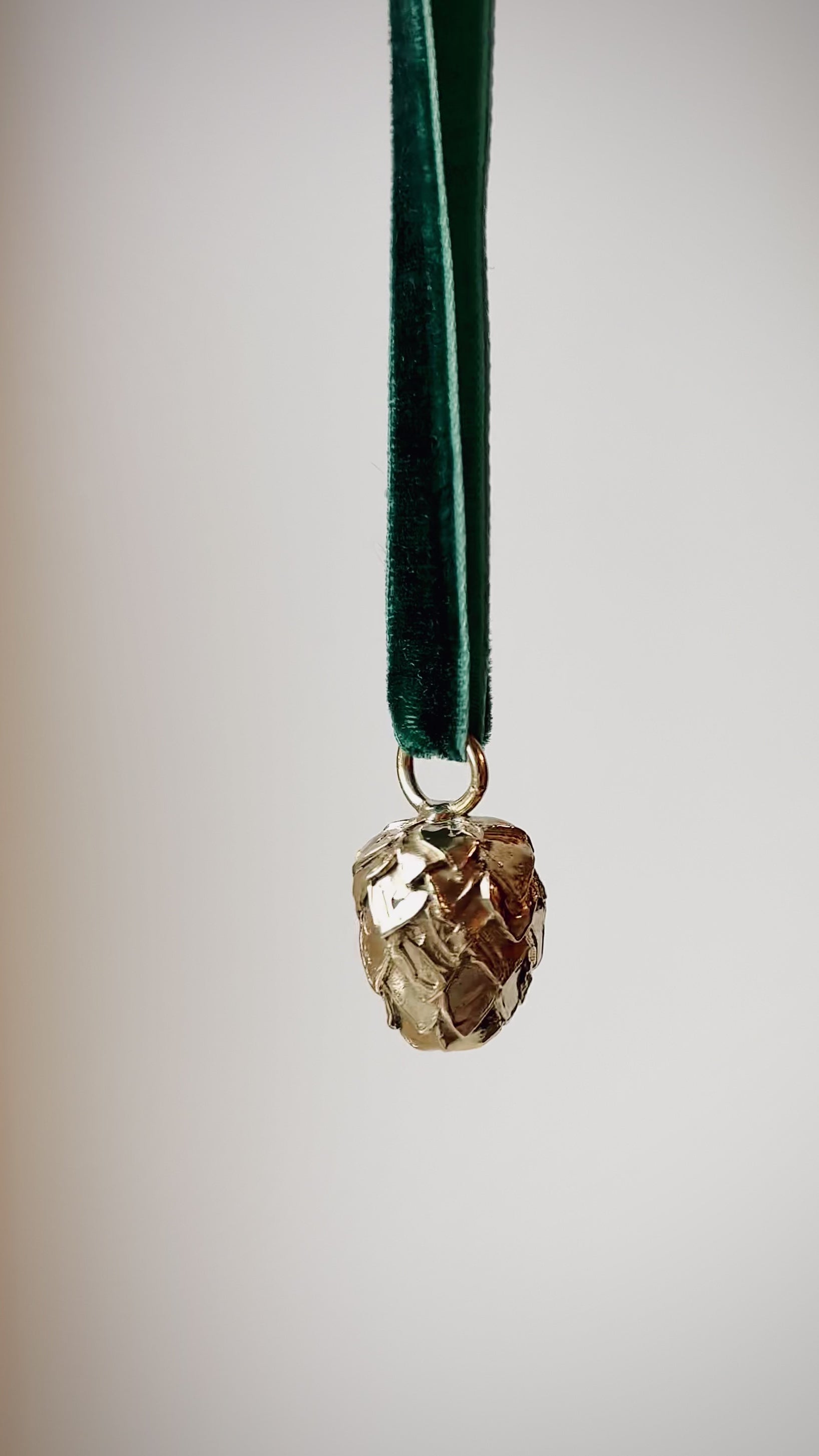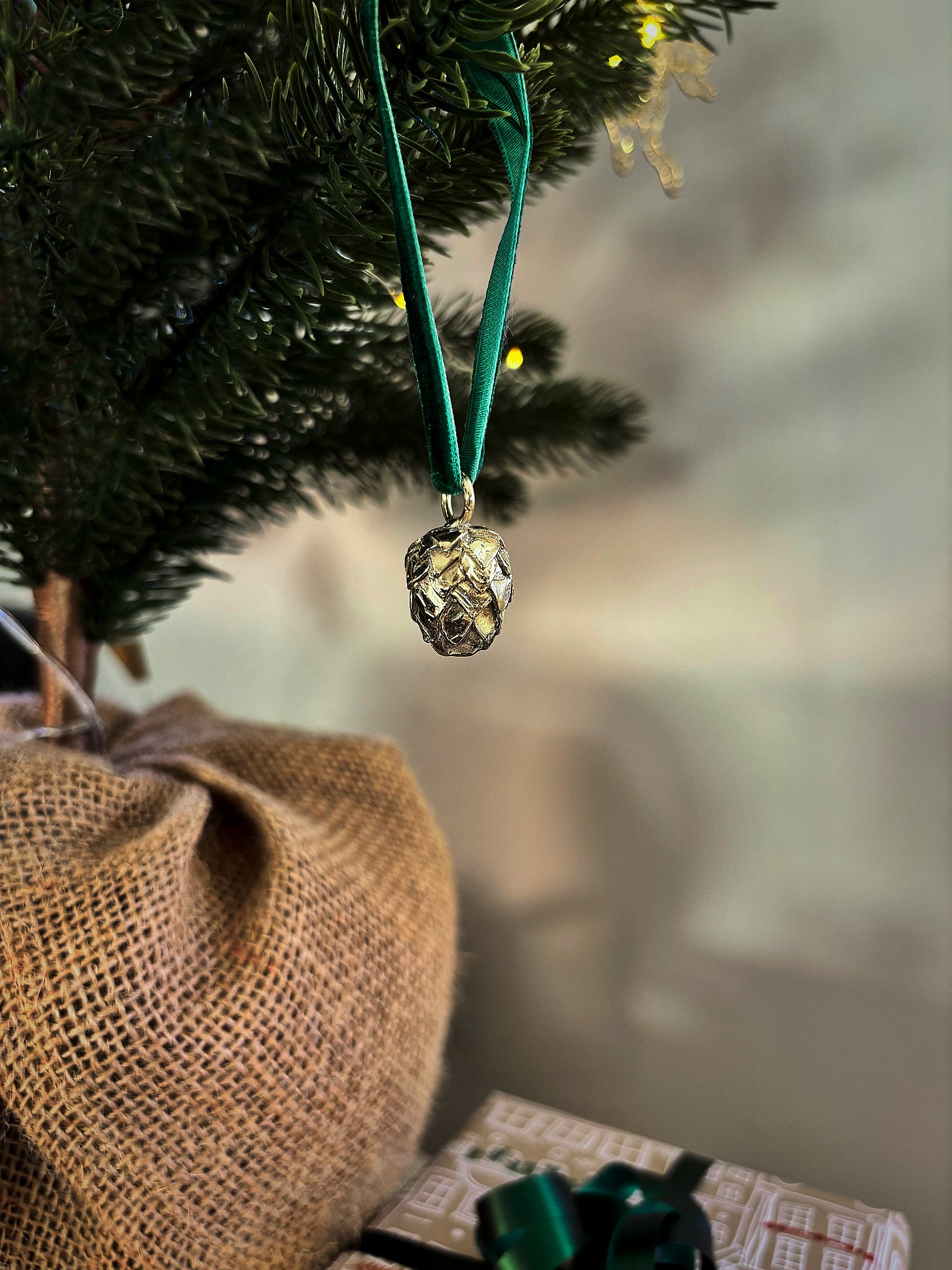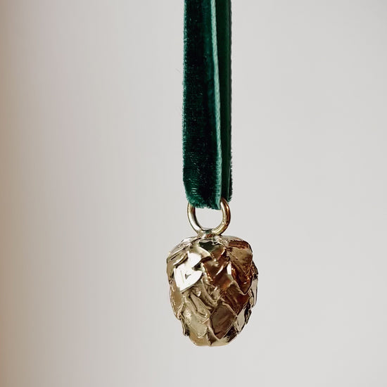Et smykke til juletreet, formet som en kongle. Håndformet og støpt i massiv messing, uperfekt på den riktige måten og med god tyngde. Heng den på en solid gren hvis du bryr deg om parketten.